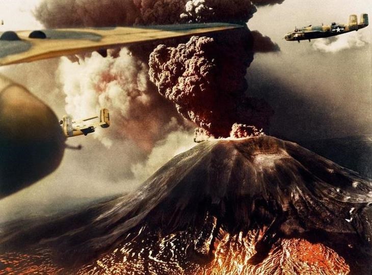 June, 1944: B-25’s enroute to their target fly by an erupting Vesuvius.