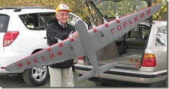 Hi, I’m repairing my old Maxim Gorky – 8-foot wingspan, and 8 motors. The attached photos were taken a long time ago, but are still representative of how it looks now after a fair amount of work. The old antenna is no longer there, but otherwise it’s about right. I’ve even redone the under-wing lettering – Maxim Gorky – in Cyrillic alphabet, as you’ll see below.